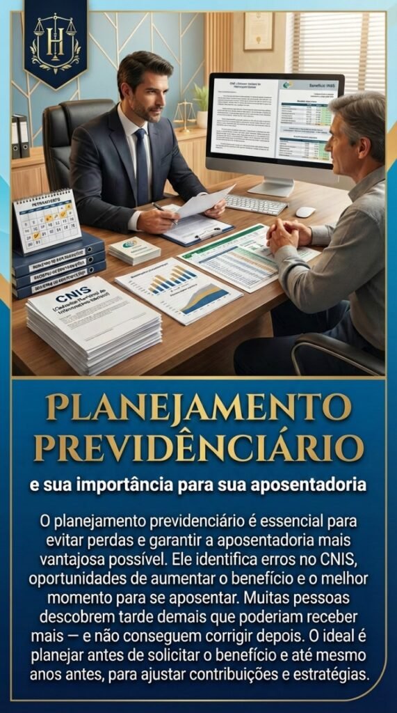 - Corrigir falhas no CNIS: O Cadastro Nacional de Informações Sociais (CNIS) é o extrato de sua vida contributiva. Muitas vezes, ele contém erros que podem prejudicar sua aposentadoria, e o planejamento ajuda a corrigi-los antes do pedido.